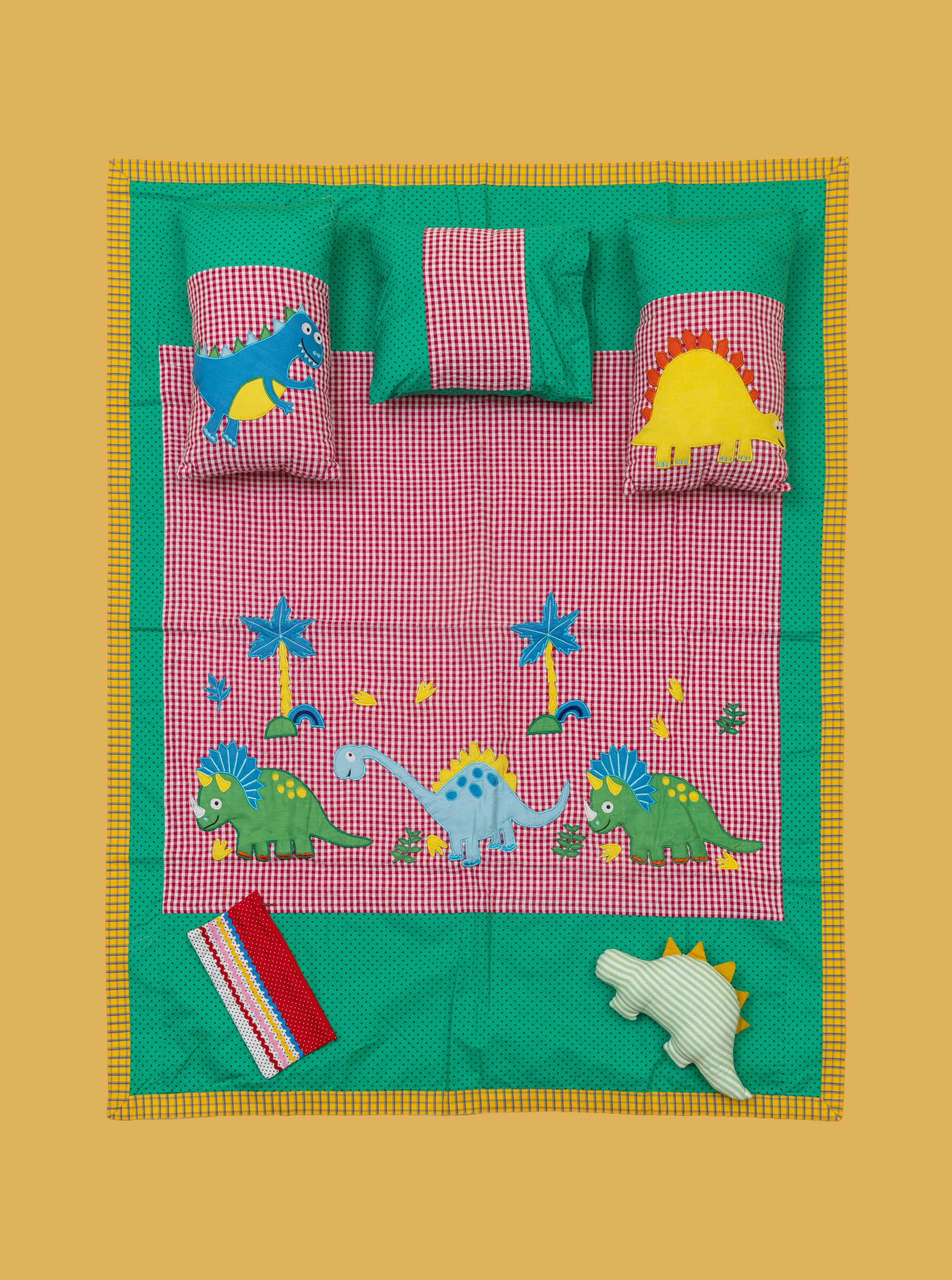 - Dinosaur-themed blanket with multi-colored appliqué designs.
